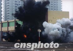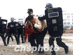 中新社成都十一月二十六日電(記者楊杰)二十多名鬧事者企圖沖擊A國駐蓉辦事處,事態(tài)正在擴大之中,消息瞬間即傳到屬地公安分局指揮室,一場恐怖與反恐怖的較量就此拉開帷幕。這是今天下午成都市反恐怖演習行動開始時的情景。有關方面的官員到現(xiàn)場觀摩了整個演習行動。