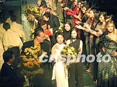 “白領(lǐng)之夜”中國(guó)國(guó)際時(shí)裝周頒獎(jiǎng)典禮二十八日晚在北京中國(guó)大飯店舉行,高級(jí)時(shí)裝為頒獎(jiǎng)典禮增添歡樂(lè)氣氛。圖為白領(lǐng)首席設(shè)計(jì)師邢燕及苗鴻冰在服裝展示后和觀眾見(jiàn)面。作者:盛佳鵬