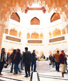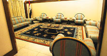 這個(gè)名為“蘇朱德”的薩達(dá)姆官邸占地面積龐大,裝飾著精美圖案的厚重鐵門正對(duì)著官邸主樓。在通向主樓的柏油路兩邊是開滿鮮花的花園和碧綠的草坪。這個(gè)三層高的拱型建筑內(nèi)部裝修豪華氣派,在八面體的墻上都雕刻著贊美薩達(dá)姆的詩(shī)句。天花板上垂下來(lái)巨大的枝型水晶吊燈。大廳旁邊還擺放著一張長(zhǎng)方形的大餐桌。
