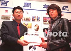 十二月三日晚,拯救白血病患的“陽光計(jì)劃1000”義演晚會(huì)在北京大學(xué)百年紀(jì)念堂拉開序幕,校園歌手老狼出任陽光大使,并進(jìn)行沉寂七年后推出的專輯<晴朗>的簽售。圖為老狼從北京大學(xué)身患白血病的學(xué)生劉正琛手中接過證書。作者:廖文靜