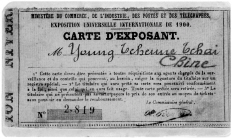 這張編號為2819的參展證正面,是顧永保的照片,還印有1900的字樣;背面上端的法文是:“貿(mào)易部、工業(yè)部、郵電通訊部1900年國際全球展覽”;參展者名字處是“永珍齋”的拼音,另起一行是法文“中國”,再下面則是三條參展的規(guī)定。