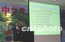 全美中文學校協(xié)會第四次全國代表大會十二月七日在芝加哥舉行,該會會員學校遍及美國四十一個州,學生五萬多名。圖為會長鄭良根在開幕式上以《美國中文教育在新世紀里騰飛》為題作工作報告,介紹協(xié)會工作情況和華文教育在美國的迅速發(fā)展。作者:趙海燕