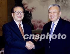 中國國家主席江澤民十一日在北京會見前來述職的香港特別行政區(qū)行政長官董建華。作者:鄭萍萍