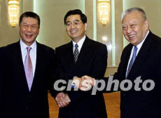 應(yīng)記者的要求,胡錦濤兩手交叉,同時(shí)握住董建華和何厚鏵的手,高興地留下了難得的合影。