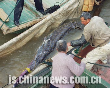 中新網南京12月12日電(記者陳光明 丁東升)冬日下的長江江面依然是寒風凜冽。南京下關漁政碼頭的江岸邊,今天上午站滿了翹首遠望的市民——他們關切和憂慮的目光投向江邊一艘漁船邊掛著的魚網里邊的“國寶”級動物——白鱘。這是漁民孫永來昨天下午二時左右在長江下關潛洲以北的江面上捕捉到的。