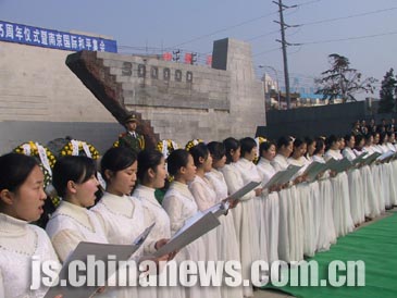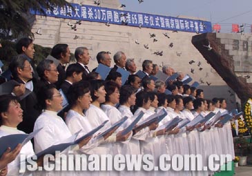 中新江蘇網(wǎng)12月13日電 (記者 王國(guó)安)今天上午,侵華日軍南京大屠殺遇難同胞紀(jì)念館的悼念廣場(chǎng)上響起“和平之聲”——在這里參加“悼念南京大屠殺三十萬(wàn)同胞遇難六十五周年儀式暨南京國(guó)際和平集會(huì)”的三千名各界人士齊聲高唱《五月的鮮花》、《紫金草,和平的花》、《和平頌》,用歌聲表達(dá)了呼喚和平、維護(hù)和平、熱愛(ài)和平、促進(jìn)發(fā)展的強(qiáng)烈愿望。