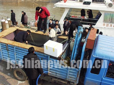 珍稀白鱘在南京出水后,因傷勢嚴(yán)重,不能長途跋涉,原向西運(yùn)到武漢的計劃改成向東轉(zhuǎn)往昆山。這里有江蘇最好的養(yǎng)護(hù)白鱘的條件。昨晚十一點五十分左右,白鱘安全運(yùn)抵江蘇昆山,救護(hù)專家們也隨車同行,對白鱘進(jìn)行治療。