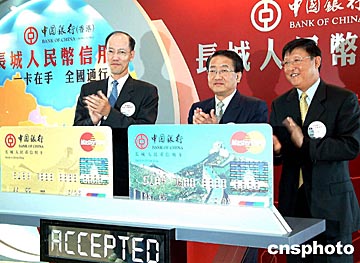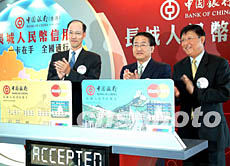 中銀香港總裁劉金寶博士、副總裁林炎南及中銀卡(國際)有限公司總經(jīng)理蘇誠信,12月17日主持儀式,推介香港發(fā)行的首張人民幣信用卡。洪少葵 攝
