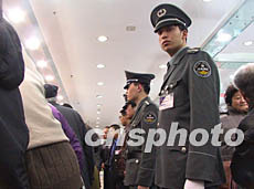 十九日是北京黃金產(chǎn)品正式銷售的第二天,仍有大批市民冒雪前往購(gòu)買金條。由于人太多,商場(chǎng)保安層層護(hù)衛(wèi)購(gòu)金隊(duì)伍。作者:王麗南