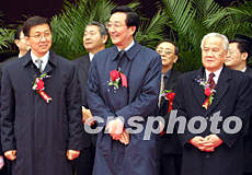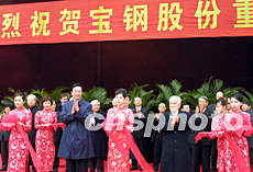 二十三日,寶鋼集團(tuán)在建廠24周年紀(jì)念日舉行寶鋼集團(tuán)自籌資金建設(shè)的寬厚板扎機(jī)及配套連鑄、1800冷扎帶鋼工程等重大項(xiàng)目開(kāi)工儀式,中共上海市委副書記、常務(wù)副市長(zhǎng)韓正(左),中共中央政治局委員、中共上海市委書記、上海市市長(zhǎng)陳良宇(中)和全國(guó)政協(xié)副主席陳錦華(右)出席。作者:湯彥俊