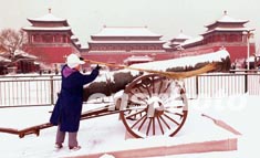 北京連續(xù)六天降雪創(chuàng)下百年紀(jì)錄。二十四日,京城終于雪過天晴,一位保潔工人正在故宮午門前清掃神威大炮上的積雪。作者:張煒