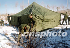 駐守東北地區(qū)的解放軍部隊(duì),十二月冒嚴(yán)寒在草原腹地進(jìn)行野外演練。圖為部隊(duì)在雪地快速搭建指揮所。作者:馬檣