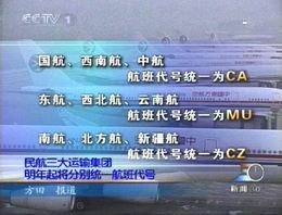 據(jù)中央電視臺(tái)報(bào)道,2003年1月1日起,重組后的國(guó)航、東航、南航三大民航運(yùn)輸集團(tuán)的航班代號(hào)將分別統(tǒng)一為CA、MU和CZ,同時(shí)西南航、中航、西北航、云南航、北方航、新疆航原有代號(hào)將不再使用。統(tǒng)一航班代號(hào)后,三大航空集團(tuán)的飛機(jī)也將分別統(tǒng)一標(biāo)志和名稱,常旅客計(jì)劃也將實(shí)現(xiàn)內(nèi)部統(tǒng)一,擴(kuò)展了常旅客會(huì)員累積里程和兌換獎(jiǎng)勵(lì)的航班范圍。同時(shí)三大運(yùn)輸集團(tuán)還將分別統(tǒng)一航空餐食標(biāo)準(zhǔn)。為了保證航班運(yùn)行正常和平穩(wěn)過(guò)渡,三大集團(tuán)近期不會(huì)對(duì)航班計(jì)劃和航線布局做大的調(diào)整。