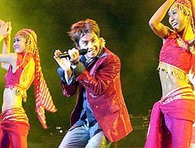 只見阿倫一身金色的服裝,再次出現在觀眾面前。而歌迷也開始離席,跑到觀眾席的最前排,不一會兒,整百位歌迷就在臺前隨著音樂起舞。
