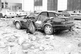 在現(xiàn)場(chǎng)采訪中記者注意到,在距高層50多米的路面上,一輛?吭诼愤叺霓I車前風(fēng)擋玻璃被擊穿一個(gè)小洞,爆炸產(chǎn)生的巨大沖擊波將玻璃、塑料碎片揚(yáng)到現(xiàn)場(chǎng)周圍,導(dǎo)致許多臨近樓房的玻璃破碎。