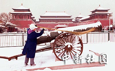 北京連續(xù)六天降雪創(chuàng)下百年紀錄。二十四日,京城終于雪過天晴,一位保潔工人正在故宮午門前清掃神威大炮上的積雪。作者:張煒