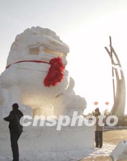 二零零三年長春凈月潭冰雪旅游節(jié)的游樂園準(zhǔn)備就緒,大型雪雕作品《雄獅》正在最后修飾,三十六個景區(qū)共有四百九十三件冰雪雕作品。作者:韓丹