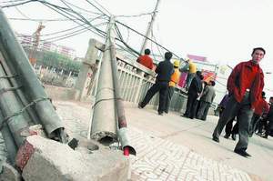 中新網(wǎng)1月3日電 昨天凌晨5時(shí)許,一輛加長貨車路過廣州市廣園西路王圣堂與京廣鐵路交匯處時(shí),不慎掛上空中鋪設(shè)的民用電纜,拉斷四根用于架設(shè)電纜的水泥桿,導(dǎo)致近300米電纜垂落在地。因搶修該電纜造成京廣線廣州段中斷一個(gè)多小時(shí),其中有一段電纜險(xiǎn)些碰上京廣鐵路2.7萬伏鐵路專用高壓電網(wǎng)。