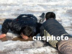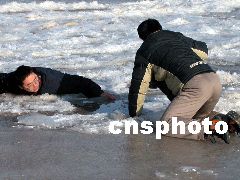 濟南一市民3日到洛口觀賞黃河封河奇觀,結果不甚落入冰窟,幸虧同伴機智向救,才僥幸生還。3日,黃河出現(xiàn)了歷史上少有的大范圍封河現(xiàn)象,許多市民聞訊前來目睹這一奇觀。河務部門提醒市民,雖然黃河已經冰封,但有些河面上冰層較薄,千萬不要在上面行走。