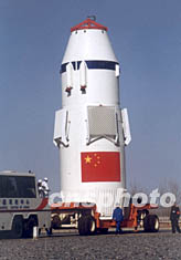 組圖:“神舟”四號(hào)飛船發(fā)射前倚立于發(fā)射塔架旁