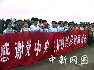 今天上午十時(shí)左右,激動(dòng)地等待第一列火車的海南百姓,打出橫幅“感謝黨中央,把鐵路修到海南島”。中新社記者 關(guān)向東 攝