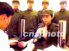 北京解放軍某部八日對新兵進行身體復查,不合格者退回原籍。解放軍部隊每年都要對新入伍的戰(zhàn)士按照體格標準進行全面復查身體,以確保士兵體格健壯。作者:宋吉河