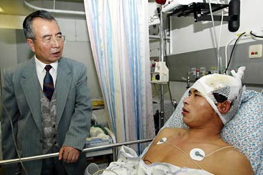 圖:以爆炸案中受傷中國勞工林金謀返家鄉(xiāng)