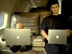 在廣告中,身高2.26米的姚明與主演電影《Mini Me》的小個(gè)子維恩·特洛耶一起搭乘噴氣式客機(jī)旅行。姚明在座位上抽出固定的電腦顯示屏,而維恩·特洛耶則拿出他自己的Power Book G4,不同的是,特洛耶的筆記本電腦擁有17寸的大屏幕,他樂(lè)滋滋地看起了《臥虎藏龍》。大個(gè)子姚明看著自己的小屏幕,再看看小個(gè)子特洛耶的大屏幕,羨慕之余又有點(diǎn)忍俊不禁,最后兩人會(huì)意地相視而笑。