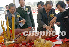 九廣鐵路公司落馬洲支線動土儀式一月九日在香港落馬洲舉行,該支線全長7.4公里,由上水站向西北伸延經(jīng)古洞、洲頭至落馬洲車站 。圖為眾官員在儀式上拜神。錢興強 攝