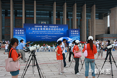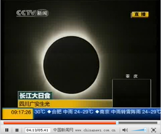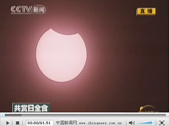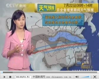 - 中新網(wǎng)報道:2009-7-22 09:58長江流域今天上午將出現(xiàn)罕見日全食,寶島臺灣也能看到日偏食,民眾相當(dāng)期待,兩岸三地首次進行聯(lián)合現(xiàn)場轉(zhuǎn)播。