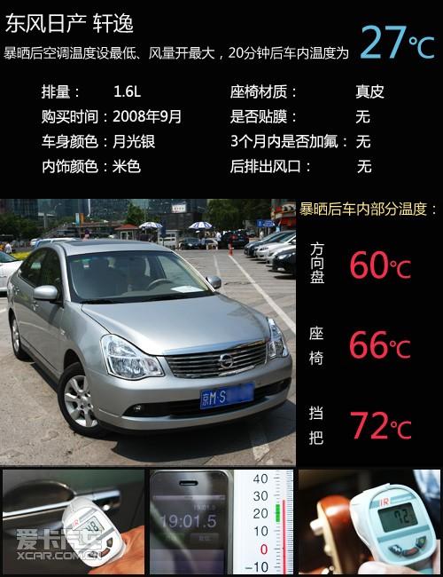 軒逸空調(diào)運(yùn)行時(shí)發(fā)動(dòng)機(jī)十分乖巧,車內(nèi)除了因測(cè)試需要調(diào)到最大的風(fēng)機(jī)聲之外,其他噪音被控制得很小,對(duì)得起舒適宜家的公眾形象?照{(diào)20分鐘的賣力工作讓車內(nèi)下降了30多度,對(duì)于08年購(gòu)買的軒逸來說表現(xiàn)可圈可點(diǎn)。