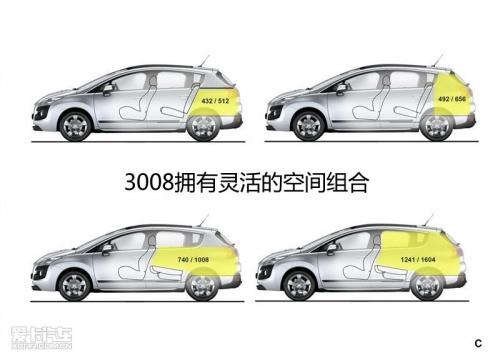 不過3008在空間的利用上非常出色,6/4分離的座椅設(shè)計(jì)可使得行李箱容積由512升擴(kuò)充至1604升,另外擁有多種空間組合。