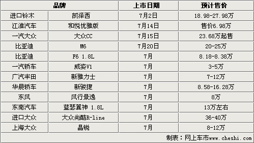 7月份上市的新車型中聚集了眾多知名大品牌。譬如一汽大眾、進口大眾、廣汽豐田等。而按照車型細分,其中涵蓋小型車、緊湊級車、以及中級車備受關(guān)注的SUV車型等,其中自足品牌占據(jù)了一半,達到了6款車型,分別是江淮和悅優(yōu)雅版比亞迪M6和F6 1.8;威姿V1;新駿捷;風(fēng)行景逸,合資車型一汽大眾CC;新雅力士;三菱翼神;晶銳,進口車型鈴木凱澤西;尚酷R-line,共計12款車型。