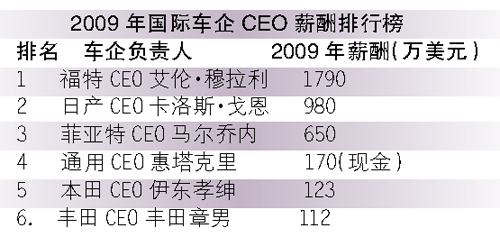 2009年,福特CEO艾倫·穆拉利的綜合薪酬(包括薪水、股票及獎金在內(nèi))在2008年的基礎(chǔ)上增加了6%,共計1790萬美元,在所有車企CEO中一枝獨秀,當(dāng)然,福特也是“物有所值”的。正是在穆拉利的不懈努力下,出售沃爾沃等品牌,集中精力做一個“福特品牌”,公司最終在2009年扭虧為盈,避免了像通用和克萊斯勒那樣遭受破產(chǎn)保護的厄運,這些努力為穆拉利帶來了綜合薪酬的增加。