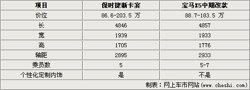 保時捷新卡宴是保時捷推出的換代車型,在外形的改變、內(nèi)飾的改變還有動力系統(tǒng)的改變上都非常的多。而BMW X5屬于第二代X5的中期改款車型,因此在外形的改變上并不十分明顯,依然保留了很多第二代X5的經(jīng)典元素。