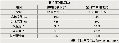 但是保時捷為卡宴標配的空氣懸架系統因其能夠實現車輛離地間隙的提升,因而在最大離地間隙、涉水深度以及接近角離去角的部分非常出色,相比BMW的X5來說這部分的優(yōu)勢在一些惡略路況下就會顯得非常明顯了。
