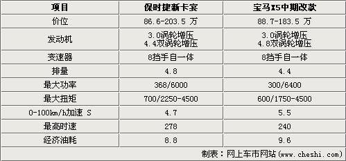 在動力部分卡宴包含V6和V8版本以及混合動力車型,寶馬新X5目前提供直列6缸和V型8缸車型。兩款車型的V6車型都帶有渦輪增壓技術其中寶馬直列6缸引擎為單渦輪雙渦管增壓器,技術上更具優(yōu)勢。