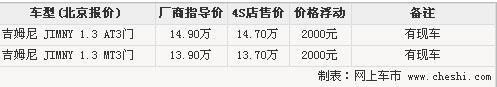 吉姆尼是鈴木引進(jìn)中國(guó)的一款微型SUV,出色的越野能力和時(shí)尚可愛(ài)的外觀,讓吉姆尼在國(guó)內(nèi)風(fēng)靡一時(shí)。不過(guò)由于價(jià)格和實(shí)際使用價(jià)值方面的問(wèn)題,吉姆尼的銷量很一般。近期,網(wǎng)上車市走訪了北京地區(qū)長(zhǎng)安鈴木4S店,了解到吉姆尼目前有2000元的現(xiàn)金優(yōu)惠,具體信息請(qǐng)參考下表:
