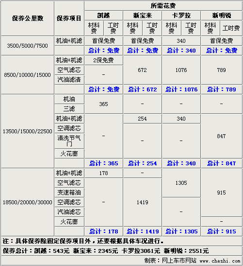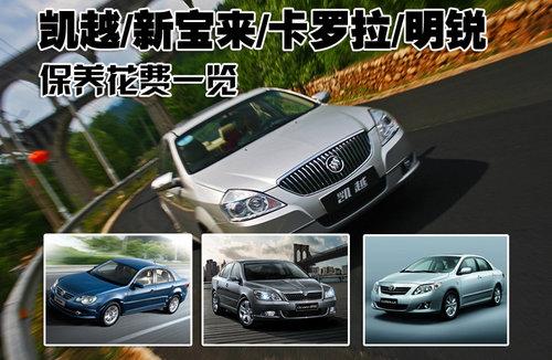 別克新凱越首保時間是四款車型中最短的,但廠家提供前兩次免費保養(yǎng),這點看來還比較貼心。18500公里結算后,543元的總保養(yǎng)金額是四款車中最少的一個。新寶來和新明銳同為大眾品牌下車型,但由于合作商不同,保養(yǎng)的費用還是存在一些細微的差距,都在2600元范圍內(nèi)。日系車一貫是經(jīng)濟實惠見長,但在后期保養(yǎng)的方面豐田卡羅拉的費用卻是四款車中最高的,超過3000元的數(shù)字也是新凱越保養(yǎng)費用的5倍多。