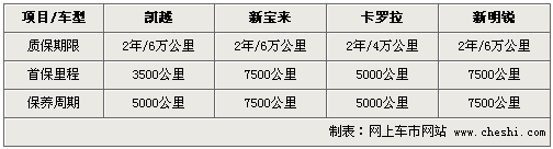 選擇的四款車型都是市場上相對銷量比較靠前的熱門車型,新凱越是別克旗下的緊湊級家用車,質保期為2年/6萬公里,一個合資車比較常規(guī)質保期限。同為2年/6萬公里還有一汽大眾品牌的新寶來,以及上海大眾斯柯達的新明銳。豐田卡羅拉是四款車型中唯一一款日系車型,2年/4萬公里的質保期比較起來少有遜色。