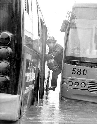 7月13日,網(wǎng)友復(fù)古魚在得意網(wǎng)發(fā)出了名為《在武漢不會開飛機的船長不是好司機》的帖子,其中附上了三張圖從不同角度反映了公交車司機“瘋狂”的一面,第一張圖中一輛公交車飛馳而過,前輪離地約30厘米,網(wǎng)友看后驚呼“果然飛起來了!”;第二張圖中公交車如同船一樣趟深水而過,大量水花濺離地面約2、3米;第三張更是“雷”人,一約六旬太婆被夾在兩公交車間正在痛苦的“跳車”,而她身下則是已沒過車輪胎的深水。