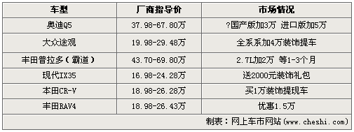在文中提到的6款熱銷(xiāo)SUV車(chē)型中,加價(jià)賣(mài)車(chē)的情況似乎有所并沒(méi)有太多弱化的趨勢(shì)。加價(jià)幅度最大的是奧迪新晉高級(jí)SUV車(chē)型Q5,國(guó)產(chǎn)版車(chē)型全系加價(jià)3萬(wàn),進(jìn)口版車(chē)型全系加價(jià)5萬(wàn)。豐田召回風(fēng)波的影響尚未煙消云散,旗下熱銷(xiāo)的SUV車(chē)型RAV4做出了1.5萬(wàn)的讓利,與之前的加價(jià)形成了非常鮮明的對(duì)比。