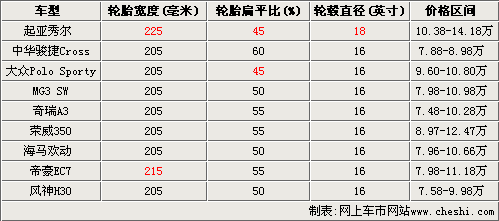 在以上車(chē)型之中,帝豪EC7系列全系都配備了215/55R16輪胎,各類(lèi)尺寸參數(shù)都比較平均,所能影響的性能和舒適度在同級(jí)車(chē)中比較領(lǐng)先。另外,大眾Polo Sporty與秀爾一樣,是采用45較低扁平比的輪胎,提升了整車(chē)的運(yùn)動(dòng)氣質(zhì)。大體來(lái)看,奇瑞A3、榮威350等偏重家用的車(chē)型,輪胎扁平比都偏高,而海馬歡動(dòng)、MG3 SW等偏向運(yùn)動(dòng)的車(chē)型,扁平比則略低。