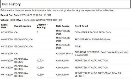 AutoCheck report與美國(guó)部份州的監(jiān)理所(DMV)有合作關(guān)系,因此如果您上美國(guó)監(jiān)理所(DMV)的網(wǎng)站,監(jiān)理所都會(huì)建議您在買車的時(shí)候,一定要檢查AutoCheck報(bào)告,在AutoCheck報(bào)告可能可以提供您買車的重要參考資料-如經(jīng)歷多少任車主,里程數(shù)為何,何時(shí)何地掛牌,是否有出過交通事故,車籍資料是否干凈(如Lemon car, Salvage or Junk title),等等歷史資料。另一份也一定要了解的是CarFax。