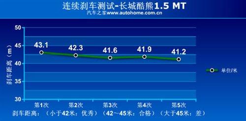 除了出色的乘坐和儲物空間,酷熊的動力和經(jīng)濟性也有不錯的表現(xiàn),從其連續(xù)制動的工況圖中可以看出,酷熊的平均制動距離在42米左右,且剎車系統(tǒng)的穩(wěn)定性也比較強。而在油耗測試中,6.7L/百公里的成績也低于我們的預期。