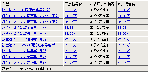 豐田漢蘭達有著寬大的車身,擁有創(chuàng)新的、寬敞的內(nèi)部空間,并配備了豪華、舒適的內(nèi)飾。而且,漢蘭達標配了同級別車型中最高標準的安全裝備。這款SUV行駛中非常安靜,而且靈敏性超凡,將多功能性和駕駛舒適性匯于一身。根據(jù)網(wǎng)上車市價格監(jiān)測系統(tǒng)顯示,目前廣汽漢蘭達最高優(yōu)惠現(xiàn)金8千元,最低售價27.28萬元,車源較緊張,詳細價格如下表:
