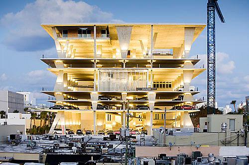 作為行人長(zhǎng)廊的補(bǔ)充,這座“雕塑車庫”在一個(gè)混凝土-玻璃結(jié)構(gòu)中結(jié)合了300個(gè)車位的車庫,零售商店和一個(gè)頂層海景餐廳。車庫的每一層都利用了自然光線,而且能夠一覽邁阿密優(yōu)美的天際線。