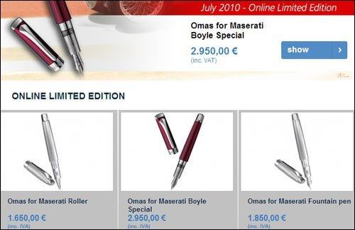 從上面的截圖可以看出,Omas for Maserati)簽字筆的售價為1650歐元,同樣銀色外觀的墨水筆售價為1850歐元,而Boyle Special是為紀(jì)念瑪莎拉蒂傳奇車型8 CTF而推出,限量生產(chǎn)70只,并且配合限量版8 CTF Boyle Special收藏車型一同發(fā)售。