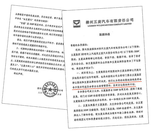 7月26日,柳州五菱汽車有限責(zé)任公司(以下簡稱五菱集團(tuán))發(fā)表致媒體公開信,明確到目前為止,五菱集團(tuán)沒有就股權(quán)和五菱品牌轉(zhuǎn)讓問題與其他股東進(jìn)行過任何磋商,也尚未接到公司主管部門要求五菱集團(tuán)轉(zhuǎn)讓股權(quán)和五菱品牌的任何決定。五菱集團(tuán)認(rèn)為,現(xiàn)在的股權(quán)結(jié)構(gòu)是符合各方股東利益及合資企業(yè)經(jīng)營需要的,沒有出讓股權(quán)的計(jì)劃……五菱集團(tuán)從開始到現(xiàn)在并在將來,會(huì)一如既往支持上汽通用五菱的發(fā)展。