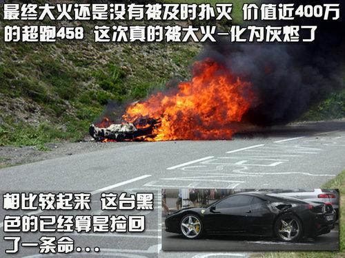 相信大家都還記得前些日子在法國(guó)巴黎發(fā)生的一起汽車(chē)自燃事件,自燃的主角是一臺(tái)全新法拉利458Italia。價(jià)值近400萬(wàn)的一臺(tái)超級(jí)跑車(chē)發(fā)生自燃,讓每一個(gè)人都為它捏了一把汗,可想車(chē)主更是焦急的上跳下竄。由于及時(shí)的救助,那臺(tái)黑色的458沒(méi)有被完全燒光,至于能否繼續(xù)上路,恐怕是兇多吉少。就在同一周內(nèi),瑞士也發(fā)生了同樣的一幕,一臺(tái)紅色的458在郊區(qū)山路旁發(fā)生自燃,這次大火沒(méi)有留情,徹底將這臺(tái)超跑吞噬一空。